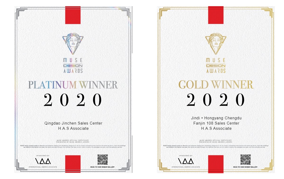 可喜的是,在本屆繆斯設計獎獲獎名單中,禾悉設(shè)計兩項參賽作品脫穎而出,分別獲得: 青島金地錦宸售樓(lóu)處 斬獲2020繆斯設計(jì)大獎最高獎項 鉑(bó)金獎,金地·弘陽成都梵(fàn)錦108銷售(shòu)中心 斬獲 金獎。