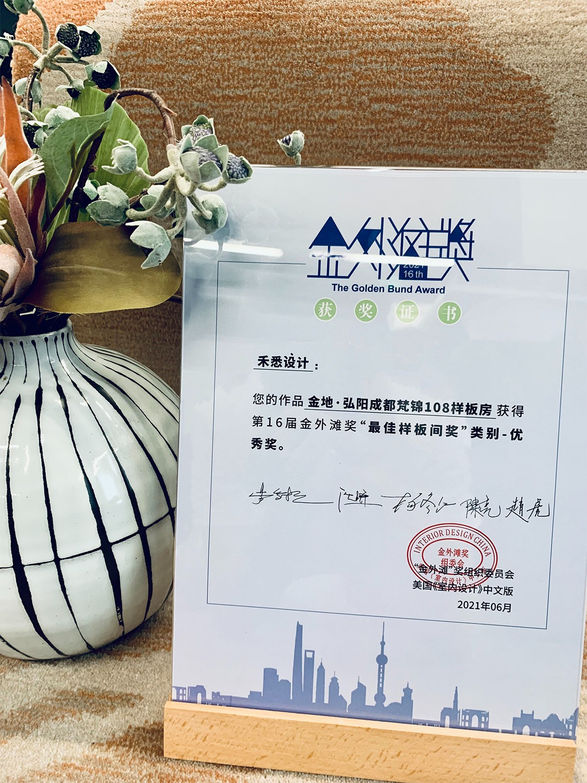 2021年6月2日,眾(zhòng)多兩岸三地精英設計師們齊聚金外灘獎啟動儀式暨金居獎頒獎盛典,共同見證這一屆(jiè)室(shì)內設計年(nián)度盛典。禾悉(xī)設計的 金地·弘陽成(chéng)都梵錦108樣板房 最終榮獲 “最佳樣(yàng)板(bǎn)間獎”類別-優(yōu)秀獎 。