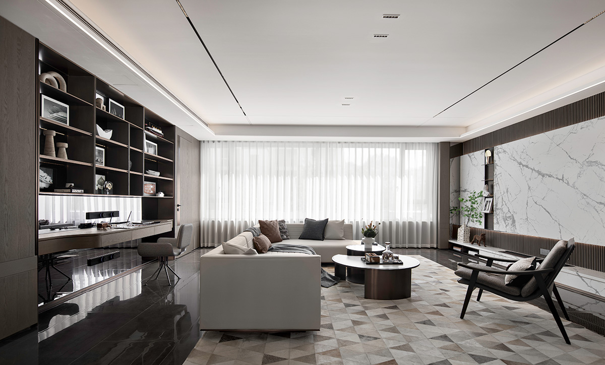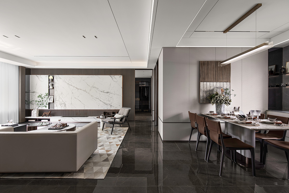 “美拉德”配色在當今時尚的表達中,常以複古焦糖色、明豔琥珀色、溫潤(rùn)原木色等(děng)色係出現在空間中,通(tōng)過(guò)簡約自然的(de)時尚筆調營造空間高格調時尚感,與鬆(sōng)弛的氛圍。開放自由的空(kōng)間布局源於對空間尺度(dù)與生活方式的雙經驗把控。通過動線布局,最大限度放低(dī)家具(jù)的高度,以保(bǎo)留整層社交空間視線的穿(chuān)透感。
