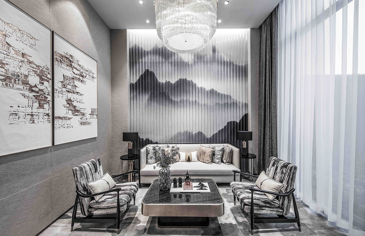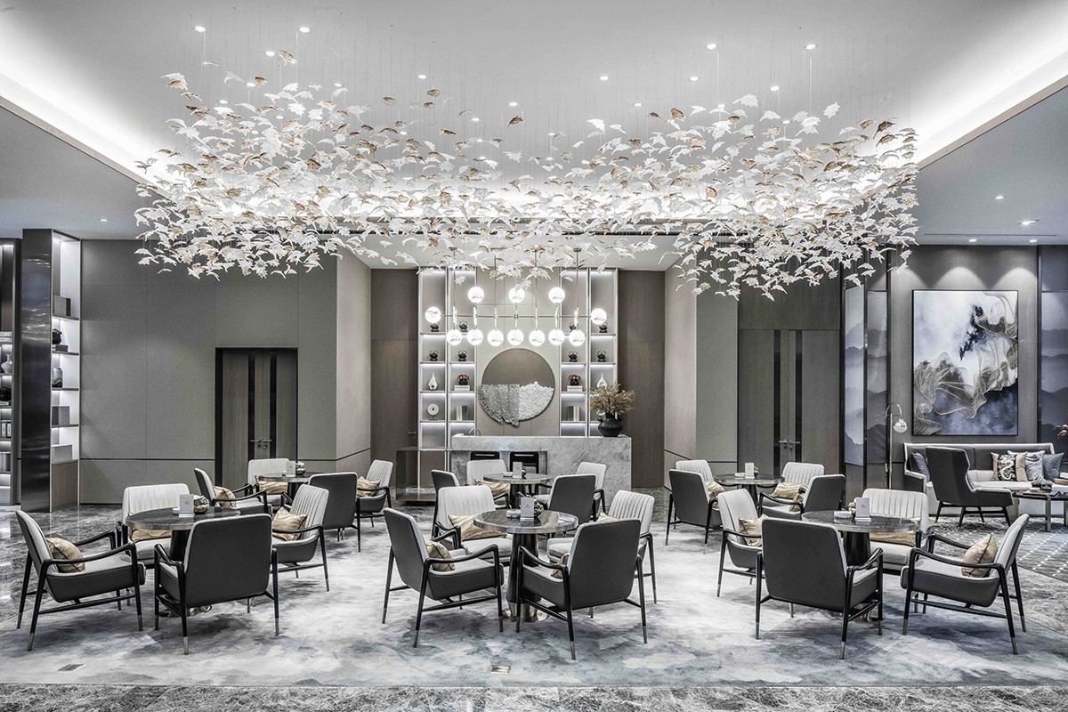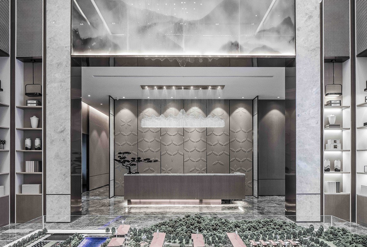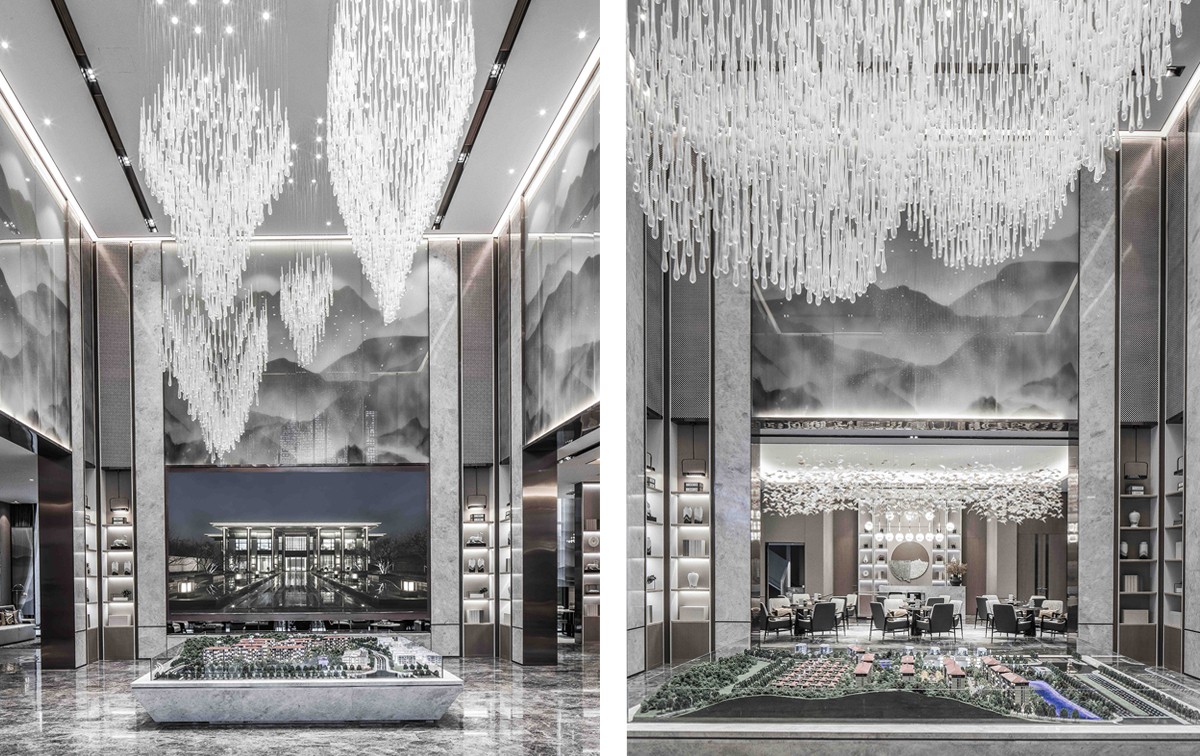 入(rù)眼即可看到水墨與山峰融匯的沙(shā)盤區。渺渺數(shù)筆,勾勒出山的姿(zī)態,水的(de)綿延,黑白交織。人(rén)們在這(zhè)裏駐足,仰望著垂瀉而下的弧形吊燈,在山和水的柔和輕擁(yōng)下, 體(tǐ)驗一段自然的旅程。