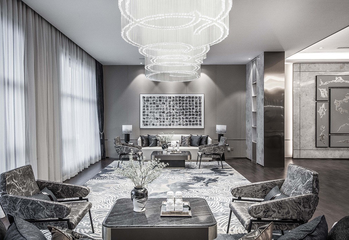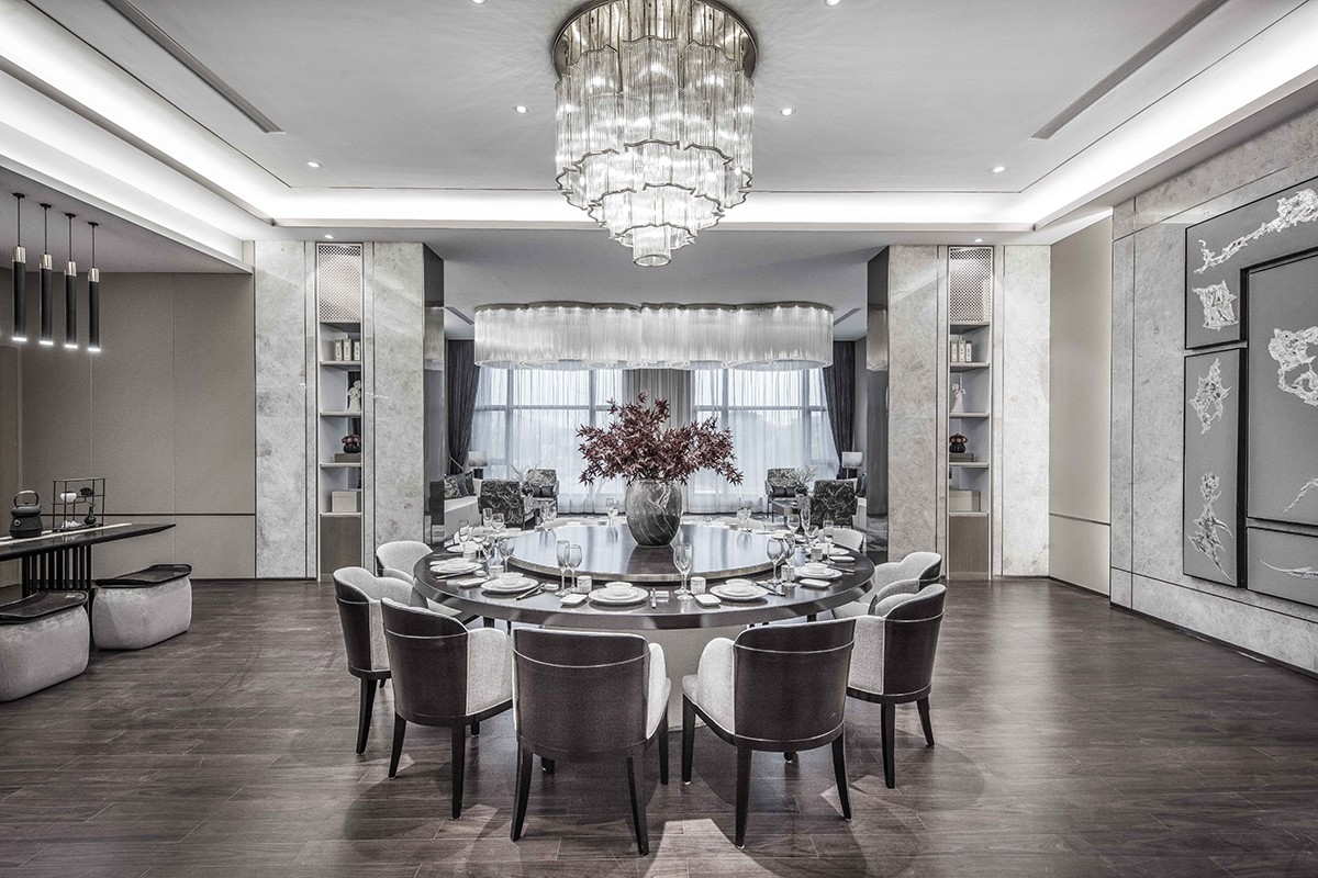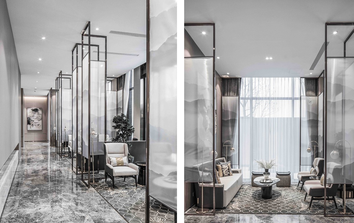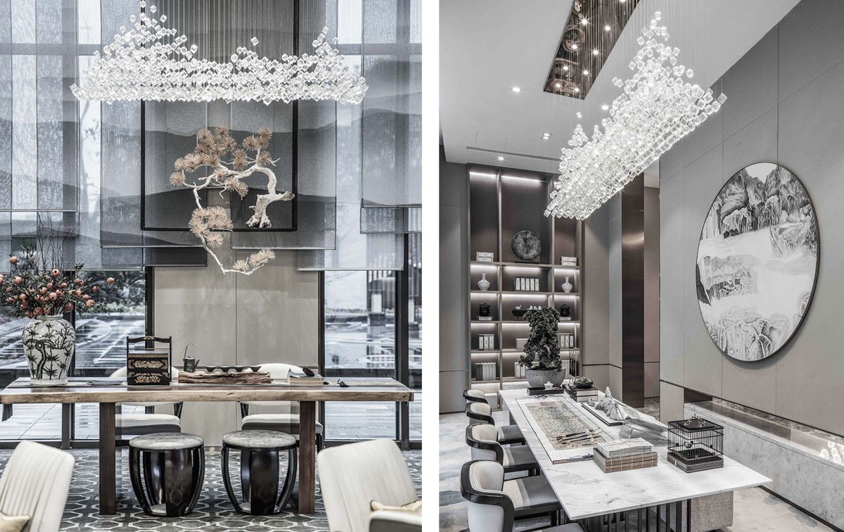 入(rù)眼即可看到水墨與山峰融匯的沙(shā)盤區。渺渺數(shù)筆,勾勒出山的姿(zī)態,水的(de)綿延,黑白交織。人(rén)們在這(zhè)裏駐足,仰望著垂瀉而下的弧形吊燈,在山和水的柔和輕擁(yōng)下, 體(tǐ)驗一段自然的旅程。