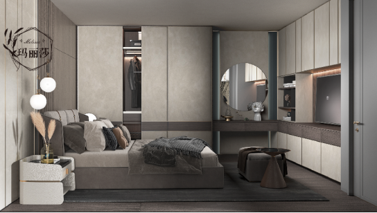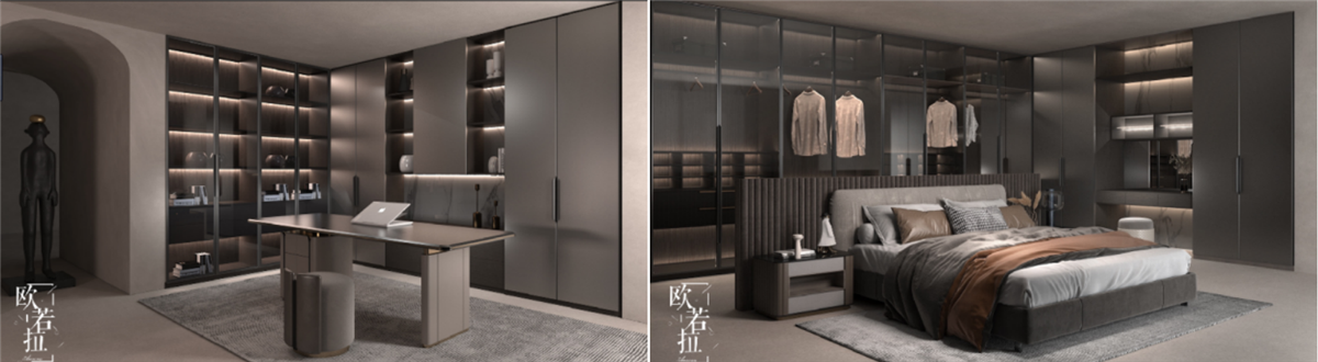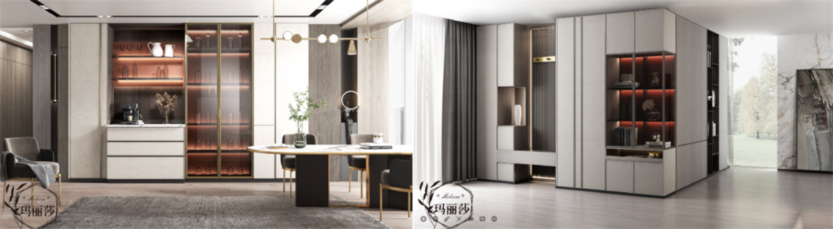 深(shēn)槍灰玻璃門搭配進口PET金(jīn)屬拉絲門板,以雲錦(jǐn)石(shí)點綴