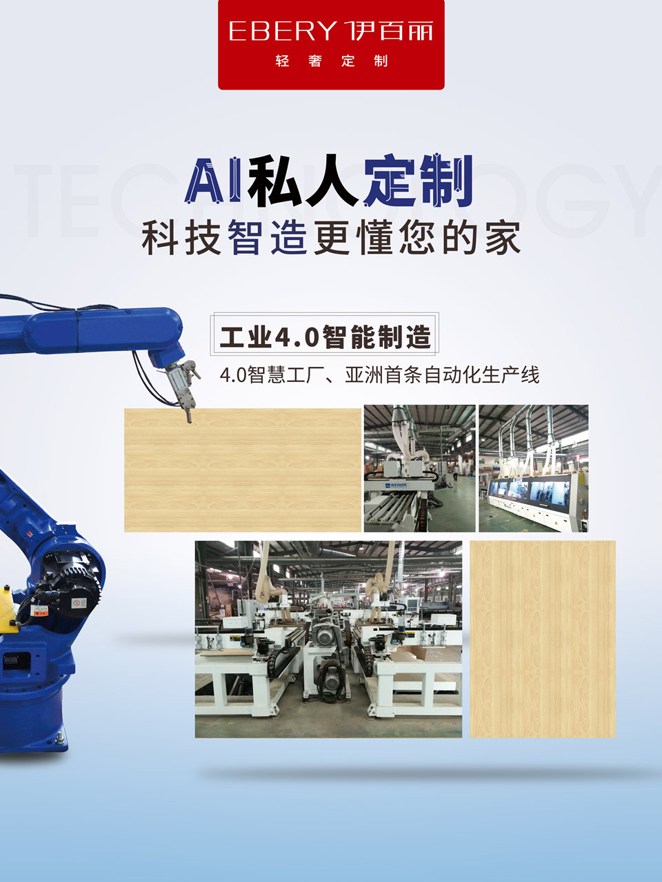 2017年7月,亞洲首條工業4.0全自動智能化生產線落戶伊百(bǎi)麗,伊百(bǎi)麗在定製(zhì)行業、輕奢定製行業率先進入工(gōng)業4.0時代。丝瓜视频破解版工業4.0智(zhì)造同時也是定製行(háng)業、輕奢定製行業亞(yà)洲首條全線貫通、從消費者選購產品(pǐn)—門店設計銷售—下單—生產—入庫——發貨—安裝—驗收—售後九大流程的(de)智造係統。每天單班可生產板件7200片左右,實現完全板不落地4.0生產模式。無需人工操作,完全顛覆傳統的生產方式。