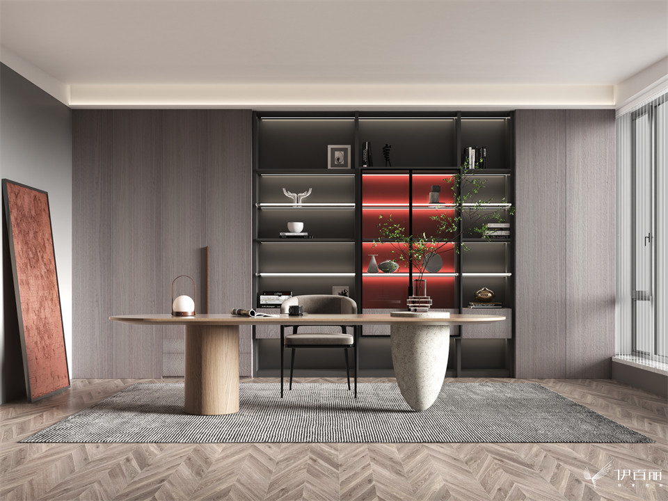書房氛圍與全屋(wū)保持一致, 侘(chà)寂、淡泊不失生活氣。