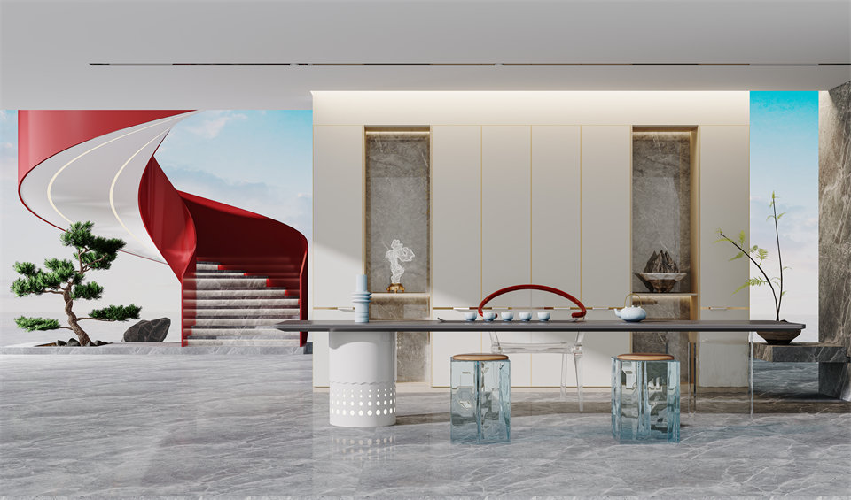 在(zài)當代藝術的解構下,將新中式的審美意象貫穿於整個空間,造(zào)就以人、以生活為中(zhōng)心的場景。鏤空置物的(de)幾(jǐ)何(hé)設計語(yǔ)言伶俐的穿行在空間之中,逸趣橫生(shēng)的藝術格調尋著變幻的光影軌跡,勾勒出現代人對返璞歸真、隨性情懷的自然流露。