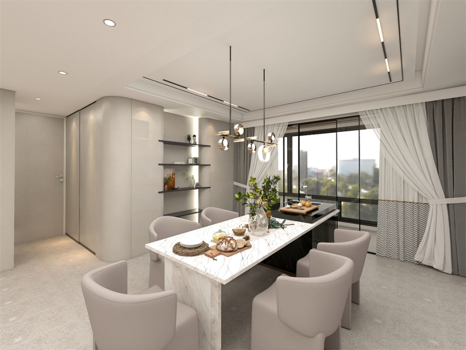 客餐(cān)廳(tīng)以白櫟(lì)橡牆(qiáng)板為統籌,賦予空間高級純粹的簡奢美學。客餐(cān)廳一體式設計,讓用餐區域(yù)與會客場(chǎng)景無界相連,實現生活模式(shì)多樣化與互動性。