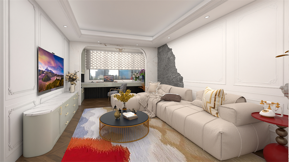 客廳電視櫃采用大麵(miàn)積(jī)的滄露白花色作為主(zhǔ)色調,搭(dā)配(pèi)水磨石地板,渲染出質雅藝術的時尚極簡風格。滿牆電視櫃全包圍設計與帶(dài)燈鋁(lǚ)層板開放格結合,收藏得(dé)宜,簡潔利落。