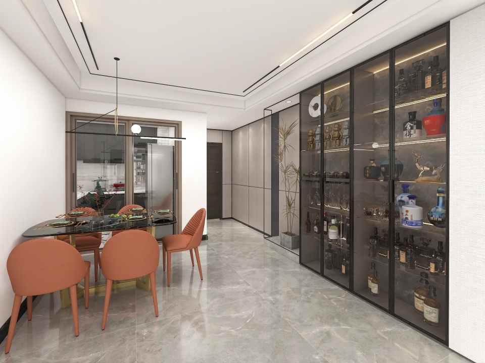 通透的玻璃(lí)櫃門圍合一麵(miàn)及頂的餐邊酒櫃,營造出輕簡明朗的空間視覺。有(yǒu)序排布的超白玻璃帶燈層(céng)板,在收藏展示各類美(měi)酒(jiǔ)、珍品的同時又可(kě)以防塵,帶(dài)來實用性和美觀性的雙重效果。