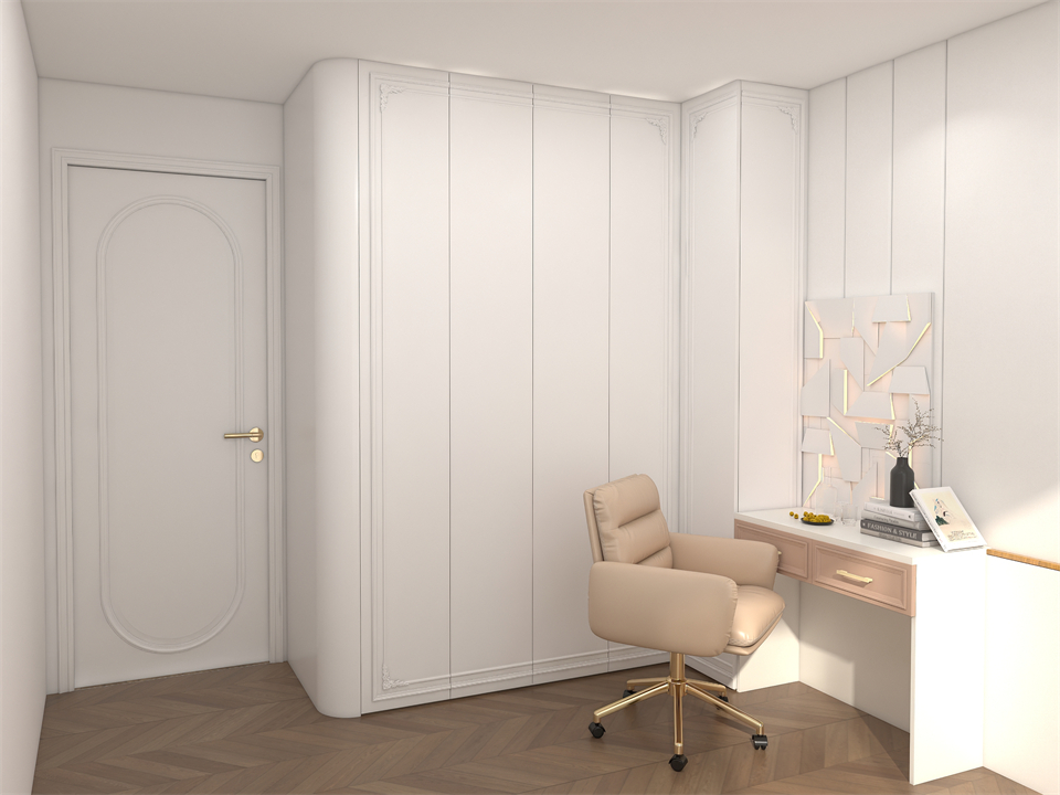 女兒(ér)房衣櫃選用奶油色係調兌質感療愈的阿瑪尼白高門,清清(qīng)淡淡之間呈現出軟糯的輕甜質(zhì)感,完美(měi)藏儲小主人的衣物。門(mén)牆櫃同色,左單圓弧、個性裝飾(shì)畫(huà)等元素的融(róng)入,讓空間頓時充滿了情感和溫(wēn)度:夢(mèng)幻精致,但又甜而不膩。