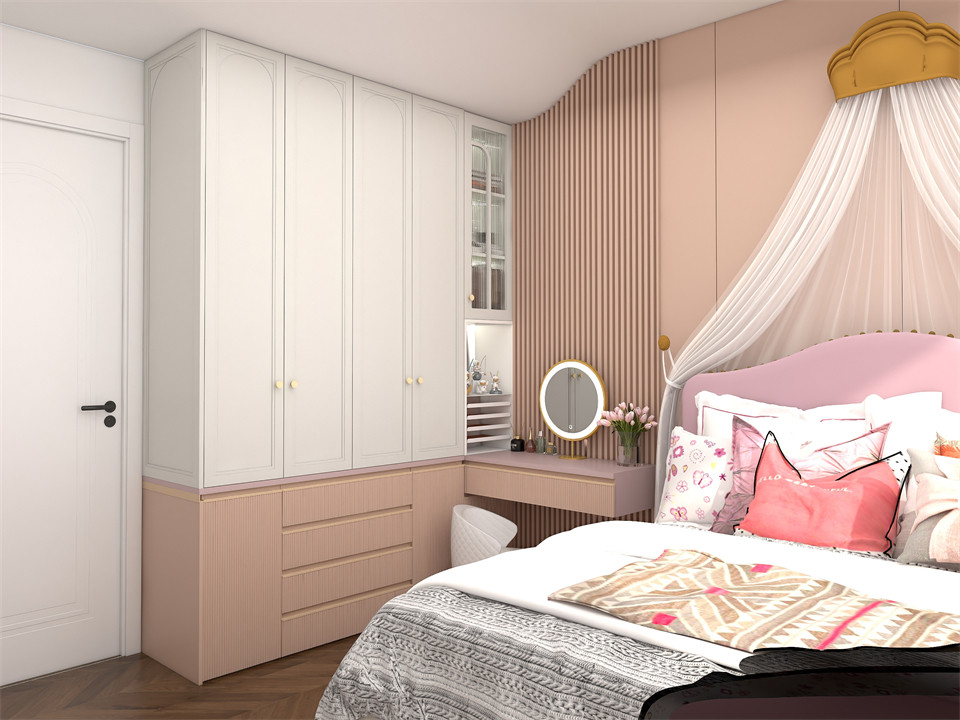 空間基調(diào)更加偏向活潑,衣櫃+梳妝台一體式定製櫃(guì),有效利用空間,讓臥室(shì)更具整體性。帶(dài)著圓弧造型的丝瓜视频破解版EO100-阿瑪尼白上櫃(guì)門與蜜桃粉下櫃門搭配,再搭配隱藏金屬拉手,實現形(xíng)與色完美糅合,打造暖性療愈的雅致空間。