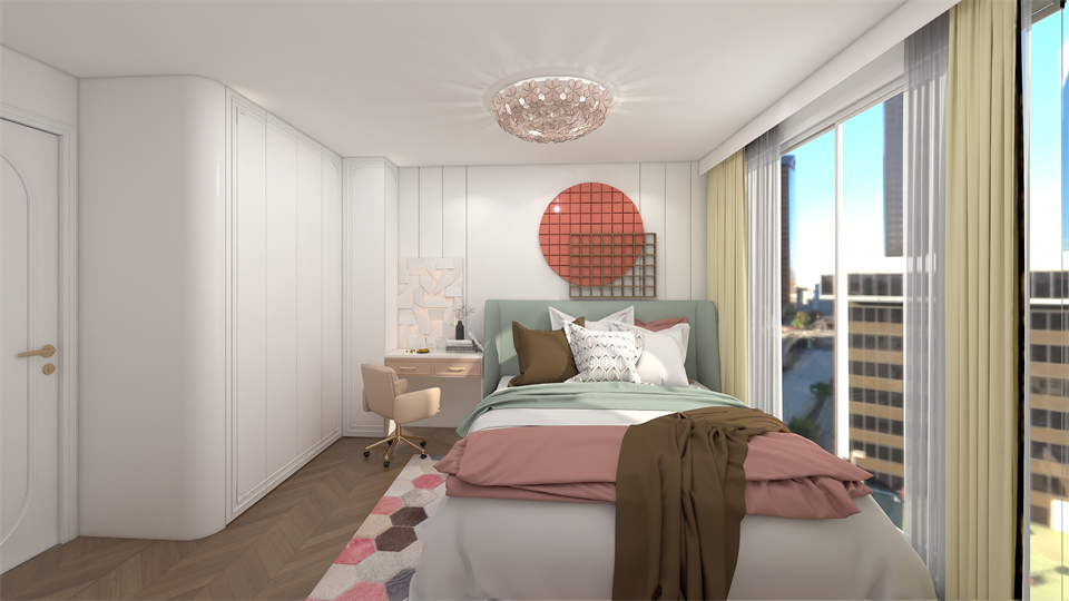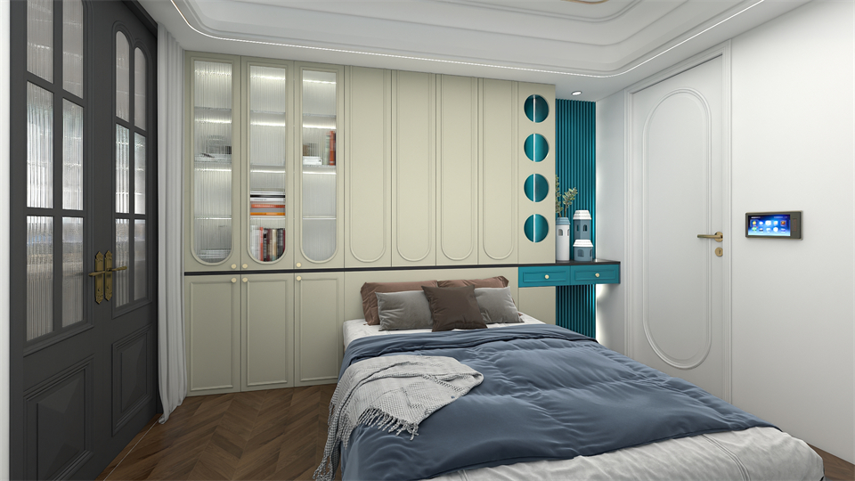 所有設計都是根據業主(zhǔ)孩子的喜好(hǎo)和(hé)需求來定製的,床頭沿牆設計到頂衣櫃+書櫃,滿滿的收納儲物(wù)空間!EO097圓形玻璃掩(yǎn)門(mén)造型的阿瑪尼豆綠,搭配懸空搭接裝(zhuāng)飾櫃,整體看上去舒適簡潔,讓生活空(kōng)間回歸(guī)純真無雜。