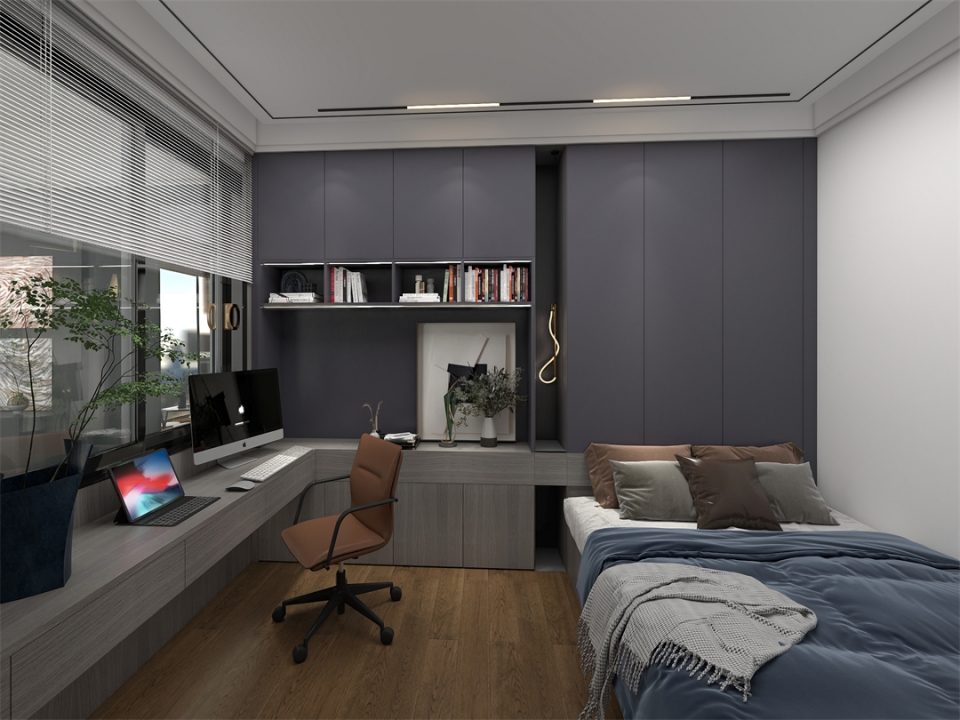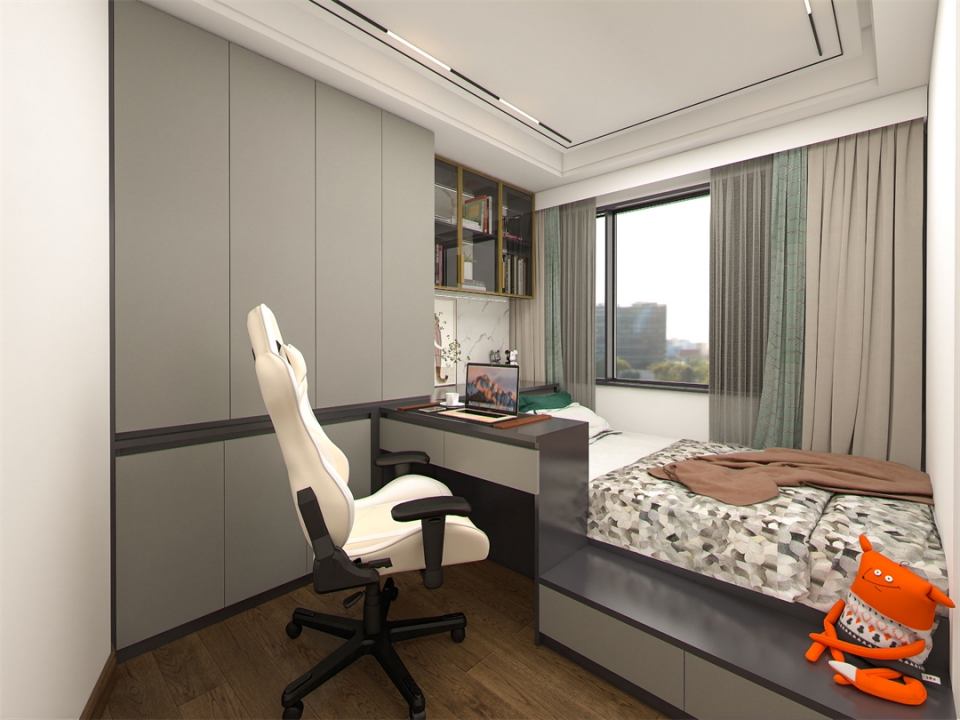 多功能男孩(hái)房做榻榻米設計,將床、書(shū)桌、衣櫃和書櫃連為一體,讓小小的臥室同時滿足學習、休息和收納(nà)等成長性需求。一字型書(shū)桌將學習區與睡眠區有效隔開,半包圍結構超有安全感。床頭的極簡玻璃櫃則可以收納一些心愛的(de)書(shū)籍、物(wù)件,既能看得著,也不用擔心落灰。一房多用的(de)男孩房,小空間也可以很(hěn)溫暖。