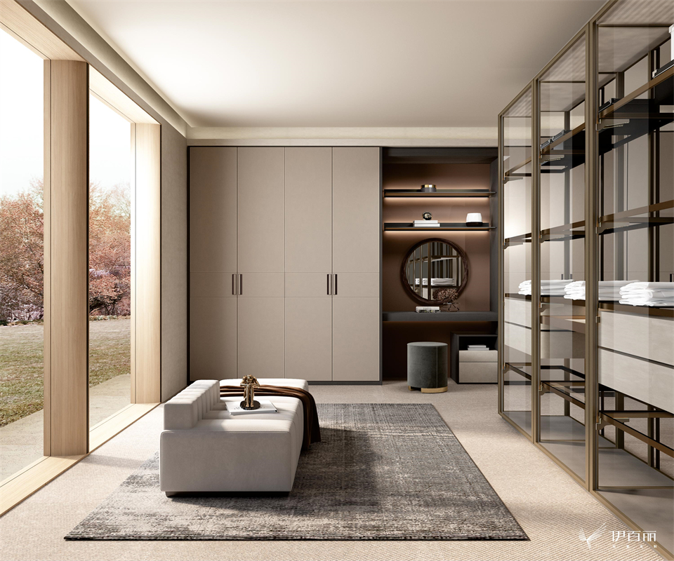 融貫(guàn)東方美學的見解,將詫寂風格純粹質(zhì)樸、真實自然的珍貴特性注入家居產品中。恰如其分地運用了低飽(bǎo)和度的櫃麵顏色,自帶輕奢優雅屬(shǔ)性,讓空(kōng)間呈現出極致的親和力玻璃的通透(tòu)視感,將掛放區、疊(dié)放區明朗展示,予人直抵內心的從容優雅和純粹的寧靜詩意。