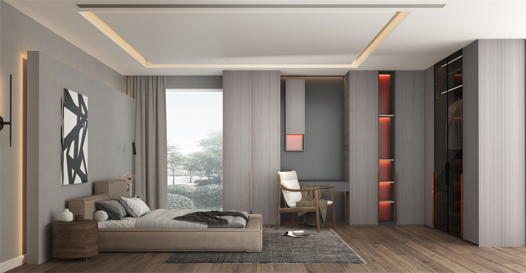 在色彩心理學上,素色具有極強的和諧舒適感。在疏朗清靜的(de)撞色空間裏(lǐ),用恬靜(jìng)柔和的“灰玉檀”為基底,加以專屬故(gù)宮(gōng)紅可見光背板點綴,鐫刻著東方詩意的悠悠(yōu)風雅。無主燈設計的(de)巧(qiǎo)妙應用(yòng),喚醒空間與人的共鳴,於無聲中彰顯著素色的獨特(tè)魅力。