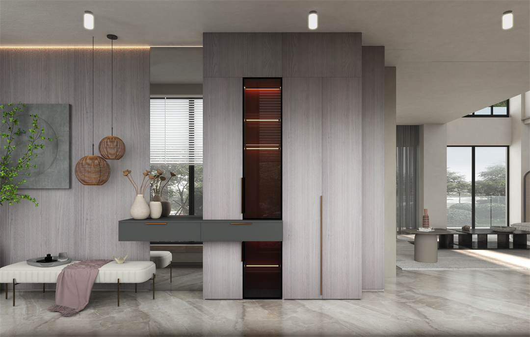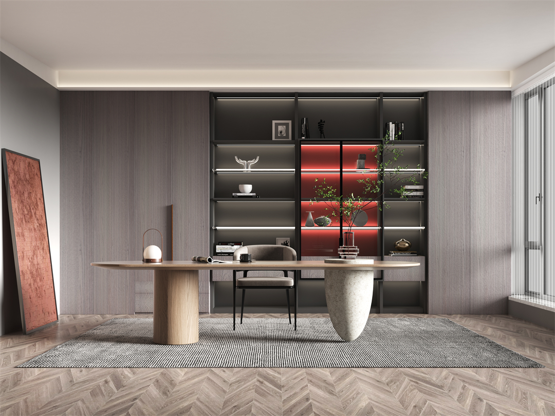同步壓紋灰玉檀麵板大麵積的應用,奠定了空間優雅質樸的(de)格調。琺琅灰抽麵為素色基調置入了濃鬱的 藝(yì)術氣息,樸(pǔ)素又不失(shī)品質,糅合出 高級又簡約(yuē)的(de)家居美學效果。