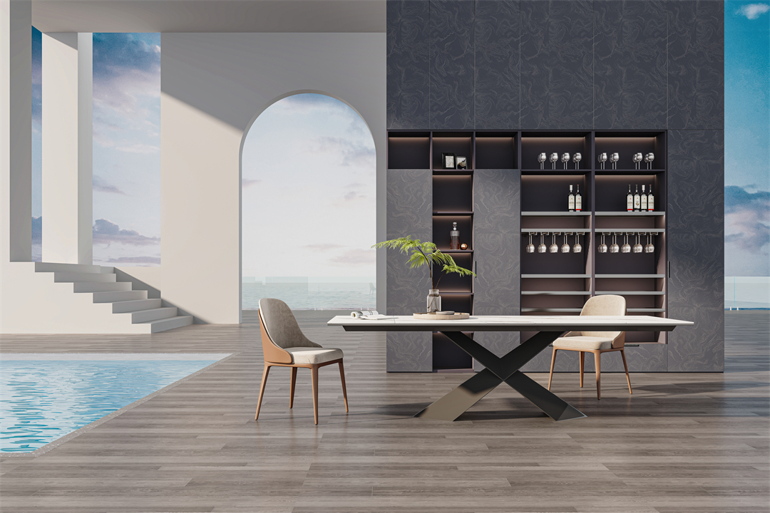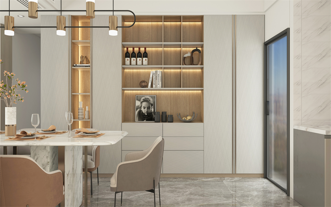 按照藏二露八的(de)定律設計,展示業(yè)主的美酒及收(shōu)藏品,彰顯不入世(shì)俗的高貴感!加之摩登秀(xiù)麗的亮光門板的點綴(zhuì),為空間注入輕奢(shē)氣質,讓用餐環境瞬間(jiān)變得高(gāo)雅!