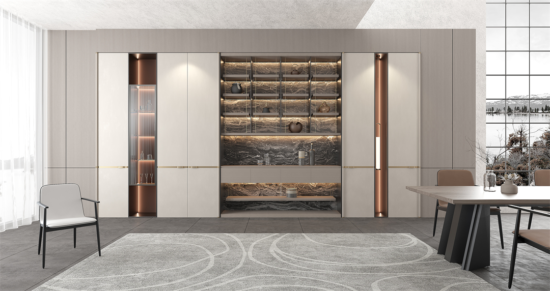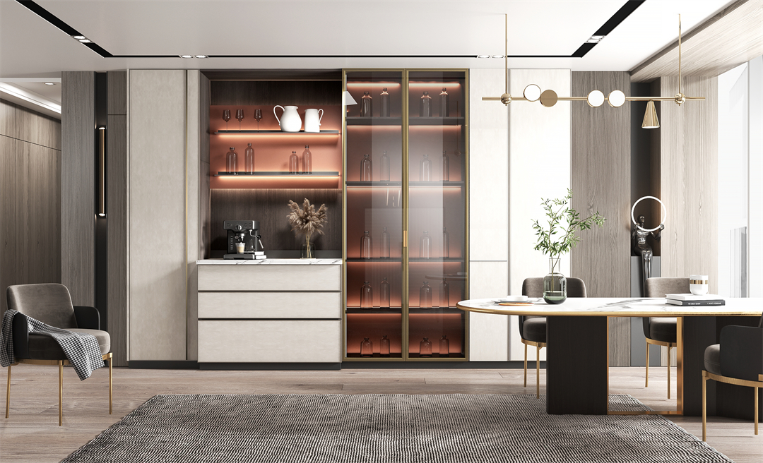通透的玻璃櫃門圍合一麵及頂的(de)餐邊酒櫃(guì),營造出(chū)輕簡明朗的空間視覺。有序排布的超白玻璃帶燈層板,在收藏展示各類美酒(jiǔ)、珍(zhēn)品的同時又可以防塵,帶(dài)來實用性和美觀性的雙重效果。