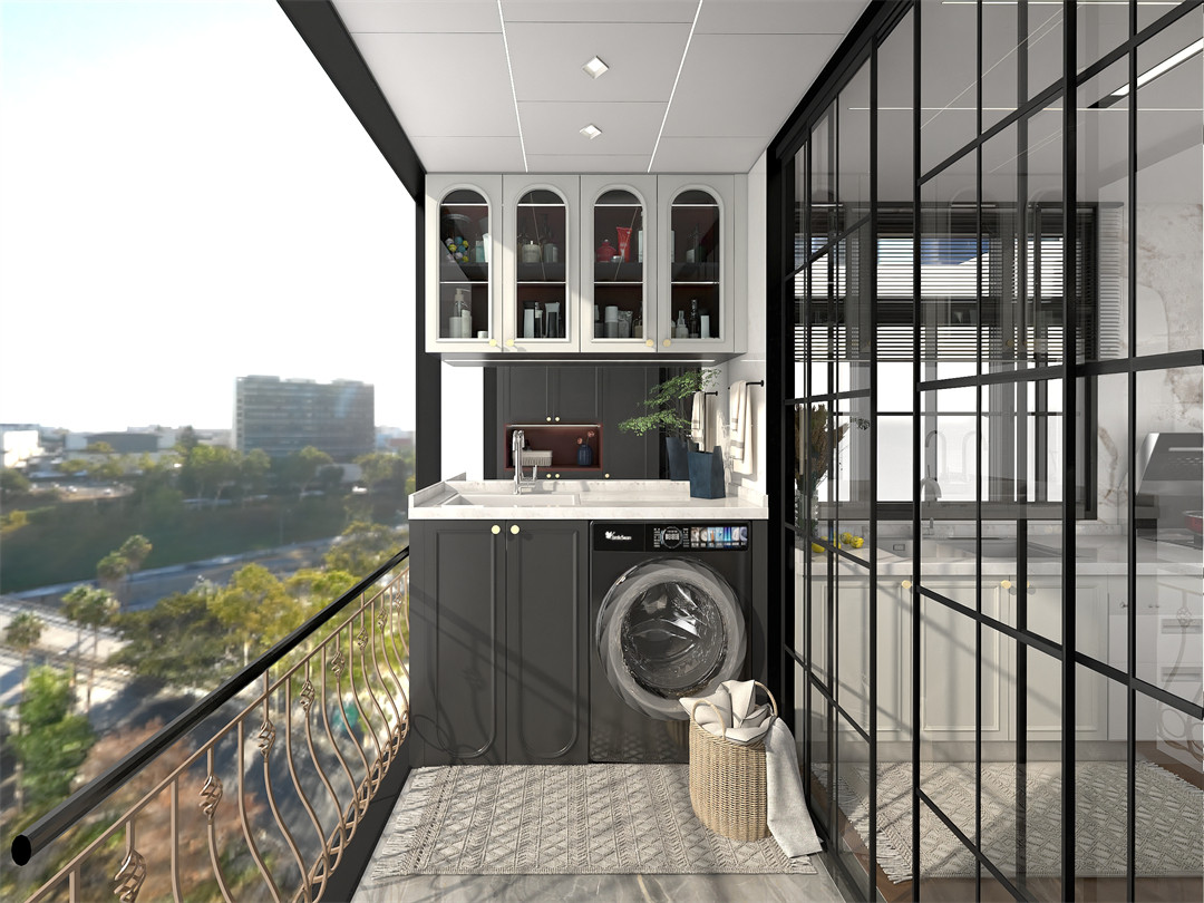 陽台櫃分段設(shè)計,上層吊櫃囤放常用物品(pǐn),方便拿取。內嵌洗衣機+洗漱區(qū)+地(dì)櫃組合,視覺統一整體,讓家庭清潔變得更為便利。EO097-阿瑪尼白+EO097-紳士灰的上下黑白櫃(guì)門搭配,簡約不乏質感,充滿法式簡約的氣息。