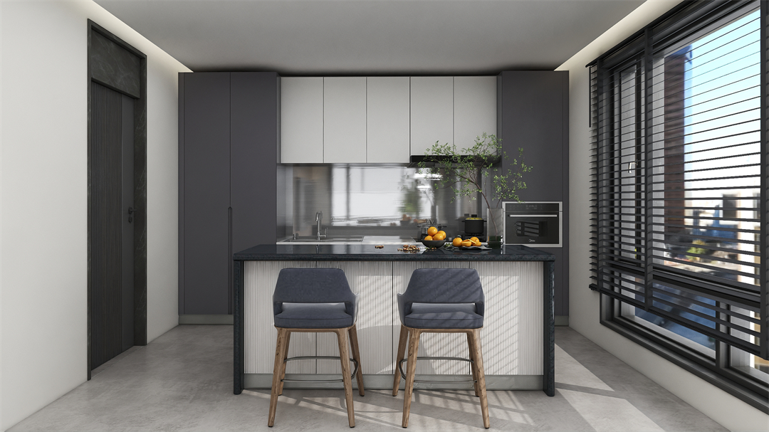 廚房結合島台做開放式設計,相互連通的空間最大限度地實現空間交融,為生活帶來更為自在、舒適(shì)的生活方式(shì)。琺琅灰與奶油白搭配櫥櫃,黑與白的對立統一,迸發(fā)出實用的收納係統,讓煙火重地也有了藝術的詩意情調。