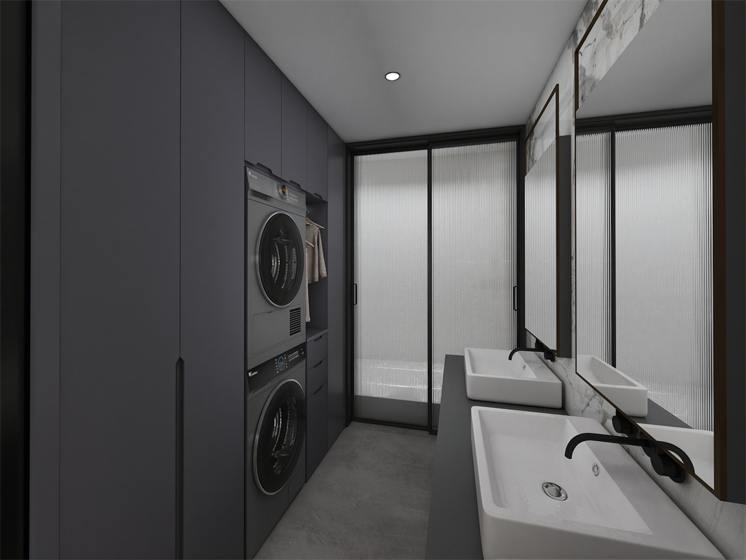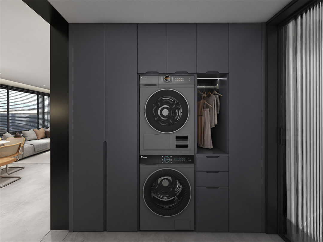 將洗漱台做外移設計,讓平時洗手或者手洗小件衣物變得更加方便。定製櫃嵌入洗、烘幹機,特(tè)留開放格懸掛常(cháng)用衣(yī)物(wù),封閉頂(dǐng)櫃高效收(shōu)納各種(zhǒng)家政工(gōng)具,為居家生活(huó)創造更多便利的美好享受。