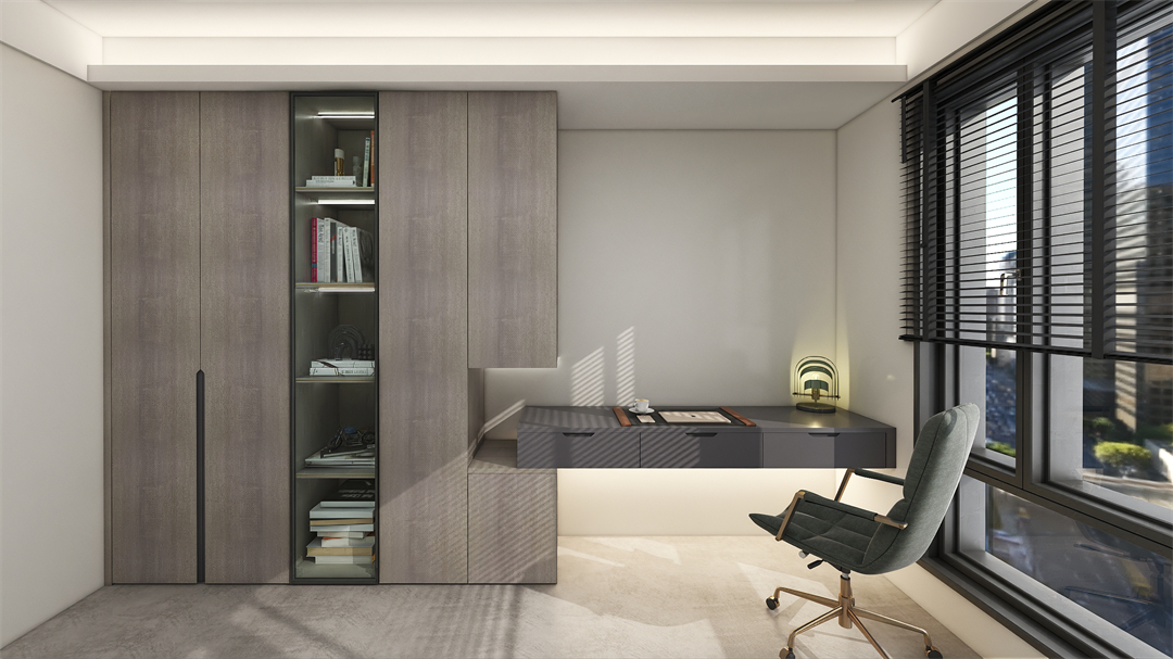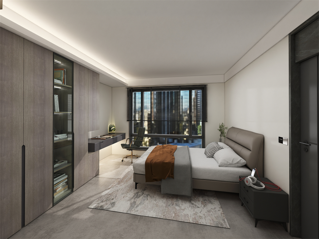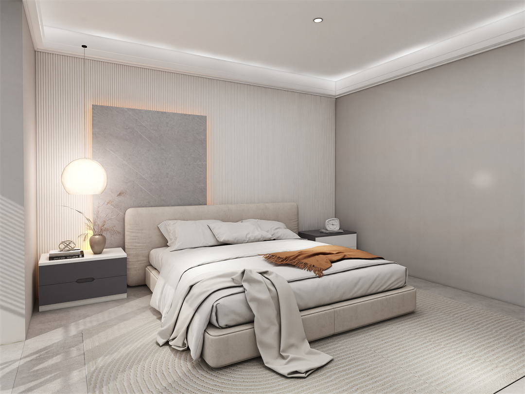 主臥空間秉承著簡潔、素淨的特色,以琺琅灰與奶(nǎi)油白為色彩基(jī)調,於極簡中不減輕奢韻致。整牆定製大麵積(jī)到頂衣櫃,科學(xué)分區布局(jú),輕鬆收納四季衣物和生活小物。原創純色J型PVC一體拉手簡約時尚,在光影的延展下,將沉穩舒適的休憩氛圍盡情展露。