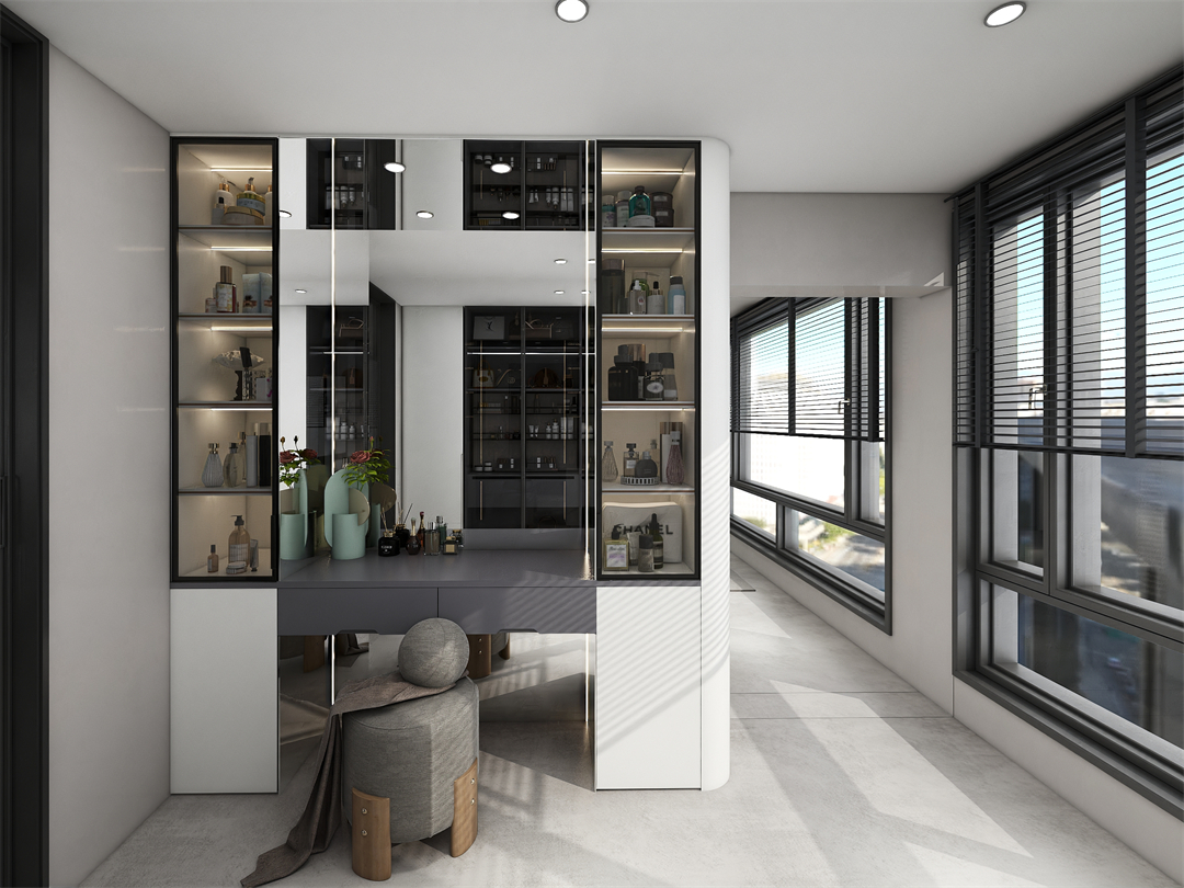 梳(shū)妝台左右兩個玻璃立櫃(guì)對稱而立,在燈光加持下有一種若隱若現的朦朧美,精致而完備的梳(shū)妝區功能布局讓女主人每天都能靚麗出行。