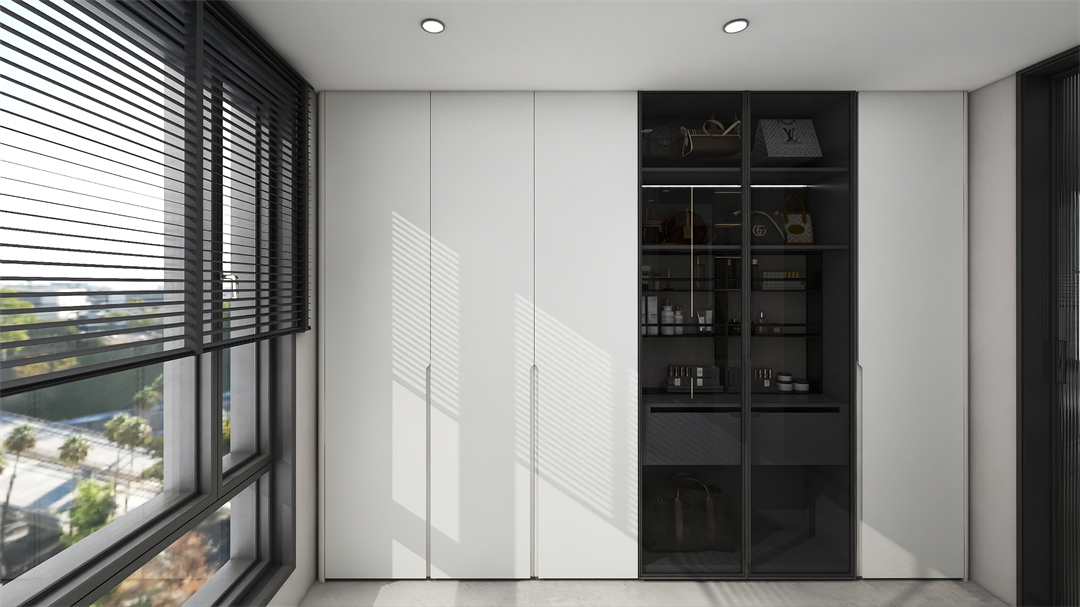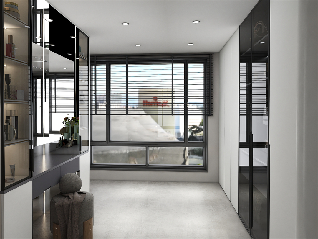 H型衣帽間布局合理,保證不同尺寸及款(kuǎn)式的衣(yī)服有妥帖的存放區域。卡其灰門板搭配鋁框(kuàng)玻璃門,讓空間呈現精致的高級(jí)範。