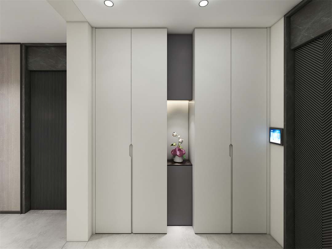滿目的卡其灰點亮(liàng)糅合(hé)幹淨通透(tòu)的入戶格調,進門即感受到一種溫柔又放鬆的氛圍。滿牆式玄關高櫃留足儲物空間,輕鬆滿足全家入戶收納(nà);中部櫃體進退設(shè)計,於平衡收納與展示中,展現主人對品質生活的追求。