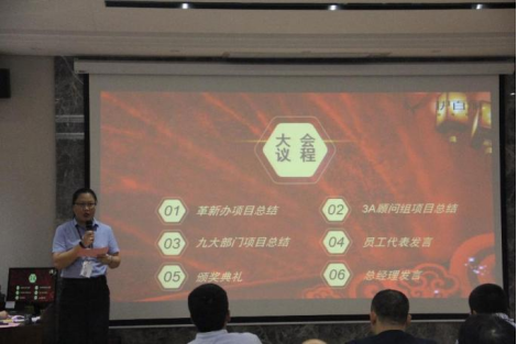 大(dà)會的議程,分為6個環節:革新辦項目總結;九大部門項目總結(jié);員(yuán)工代表發言;3A顧問組項目總結(jié);頒獎(jiǎng)典禮;領導總結發言(yán)。
